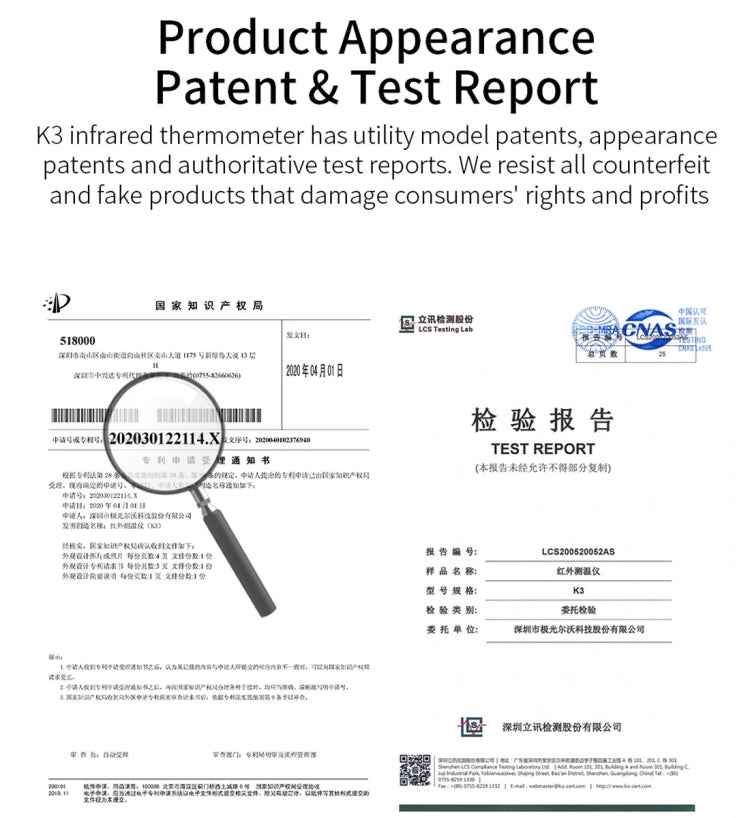 16. Support voice broadcast, body mode broadcast: "normal" "abnormal". Surface mode broadcast: measuring temperature data.