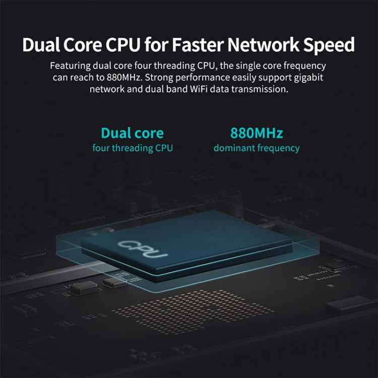 2. Equipped with dual-core four-thread processor, the single-core frequency is up to 880MHz, and the powerful performance easily supports data forwarding of Gigabit Ethernet port and Gigabit dual-band Wi-Fi, and the Internet experience is smoother.