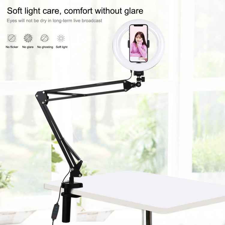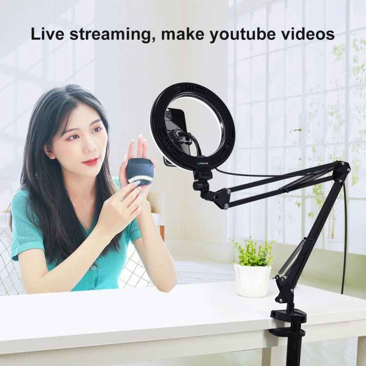 PULUZ 7.9 inch 20cm Ring Curved Light + Desktop Arm Stand USB 3 Modes Dimmable Dual Color Temperature LED Vlogging Selfie Photography Video Lights with Phone Clamp