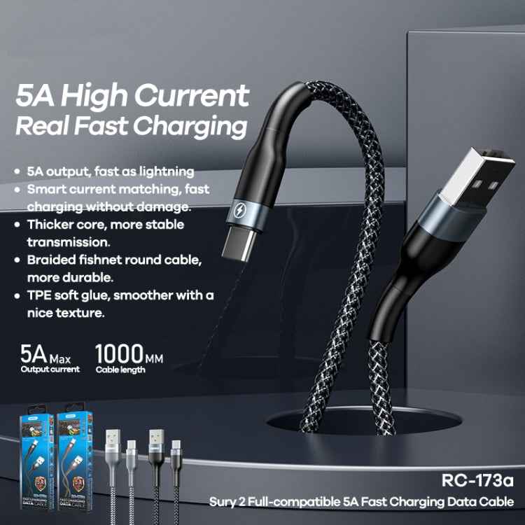 REMAX RC-173a 5A USB to USB-C / Type-C Sury 2 Fully Compatible Fast Charging Data Cable, Cable Length: 1m