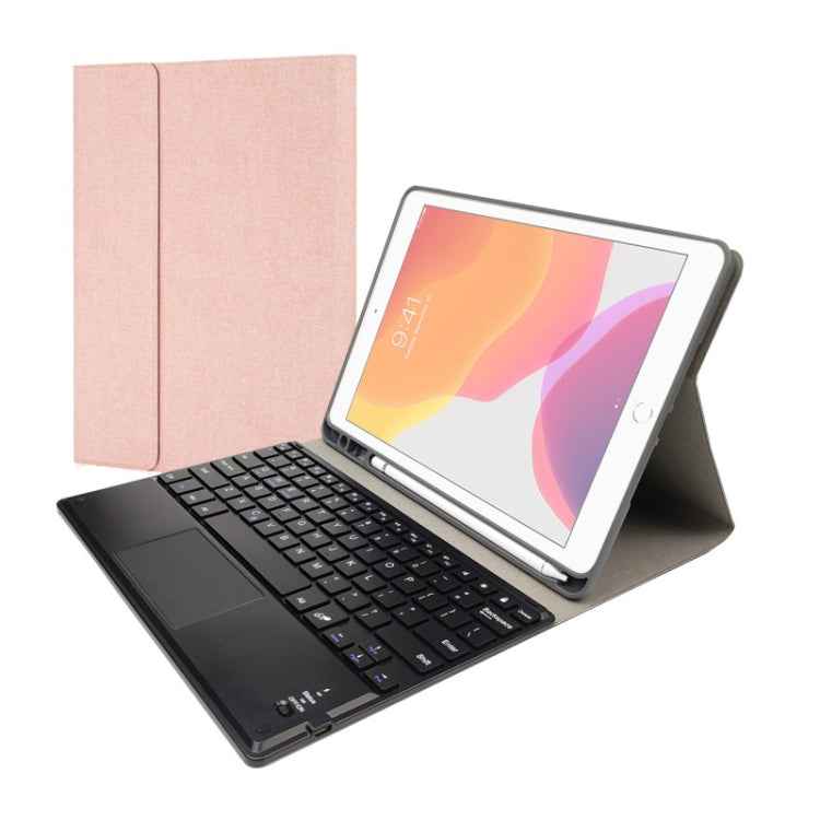 RK102C Detachable Magnetic Plastic Bluetooth Keyboard with Touchpad + Silk Pattern TPU Tablet Case for iPad 10.2, with Pen Slot & Bracket