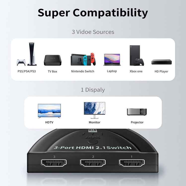 6. One-Button Switching: HDMI-compatible switch 3 in 1 out with manual switch button, Just press the button could easily switch the source you like.