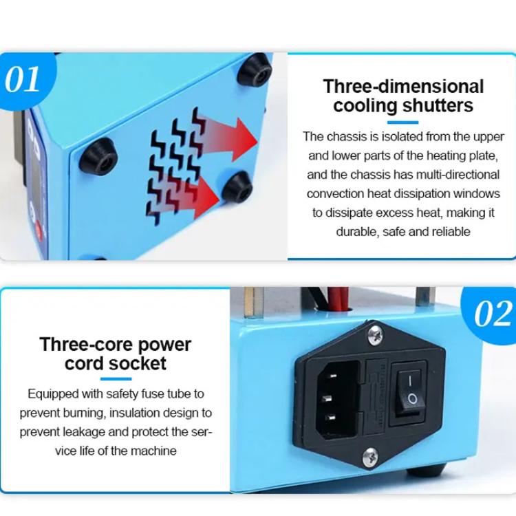 6. Three-dimensional heat dissipation shutters, upper and lower isolation of the chassis and the heating plate, multi-directional convection heat dissipation windows of the chassis, dissipation of excess heat, durable and safe