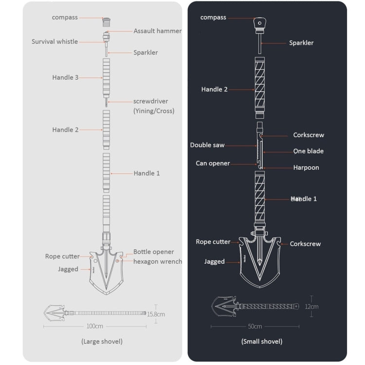 2. This multifunctional shovel is a multifunctional tool that can be used as an excavator, shovel, saw, pick, bottle opener, rescue whistle, magnesium oxide stick, fire ice cream, hammer, nail cover, ruler, wrench, etc. Wait