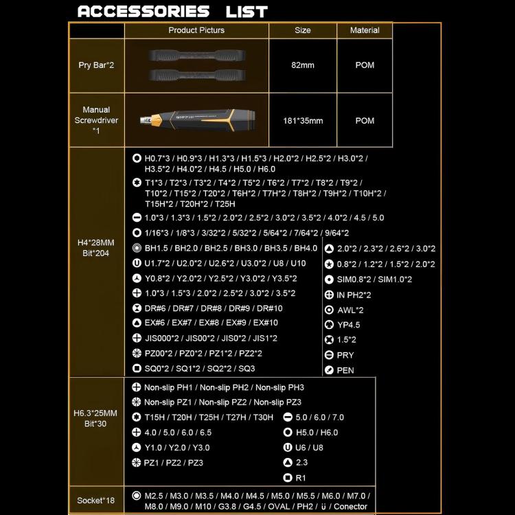 3. With Y08 multi-functional electric screwdriver handle, with 2-in-1 connectorfunction; Compatible with most H4.0 and H6.3 bits on the market without additional adapter; Electric torque up to 1Nm, manual torque withstands 4Nm