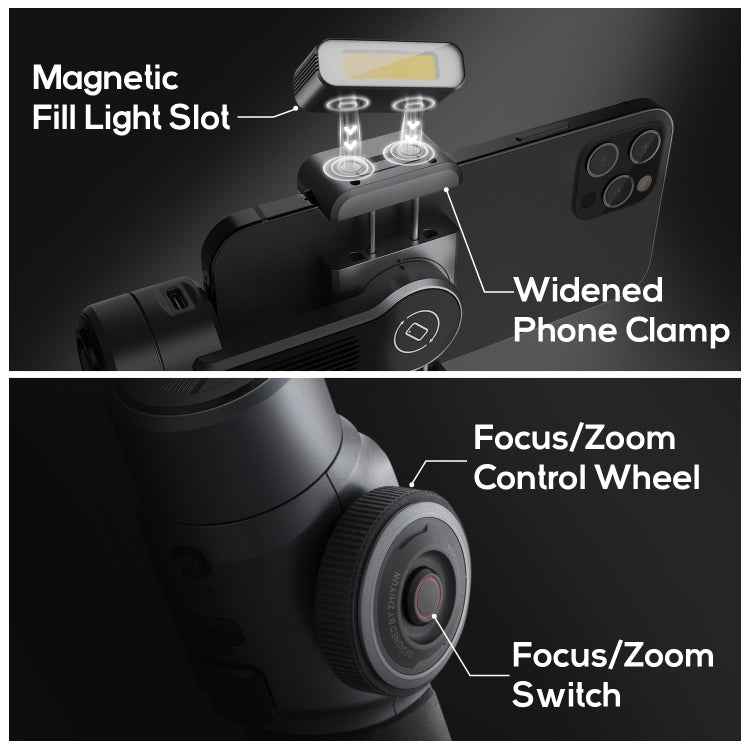 2. Professional magnetic steel motors with upgraded algorithms and wider phone clamp ensure a safer and easier filmmaking experience. Strong compatibility allows mounting a phone even with wide-angle, telephoto, fish-eye and macro lenses.