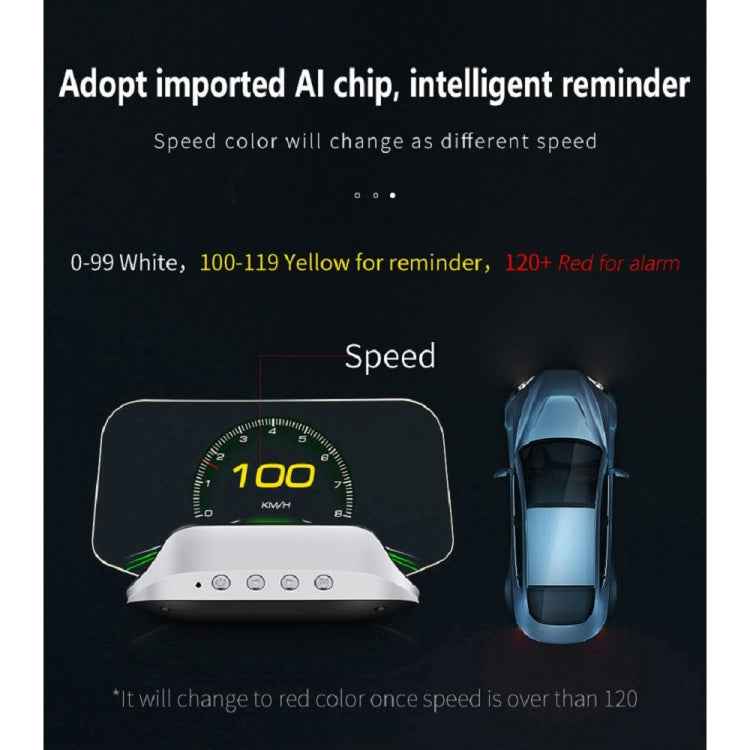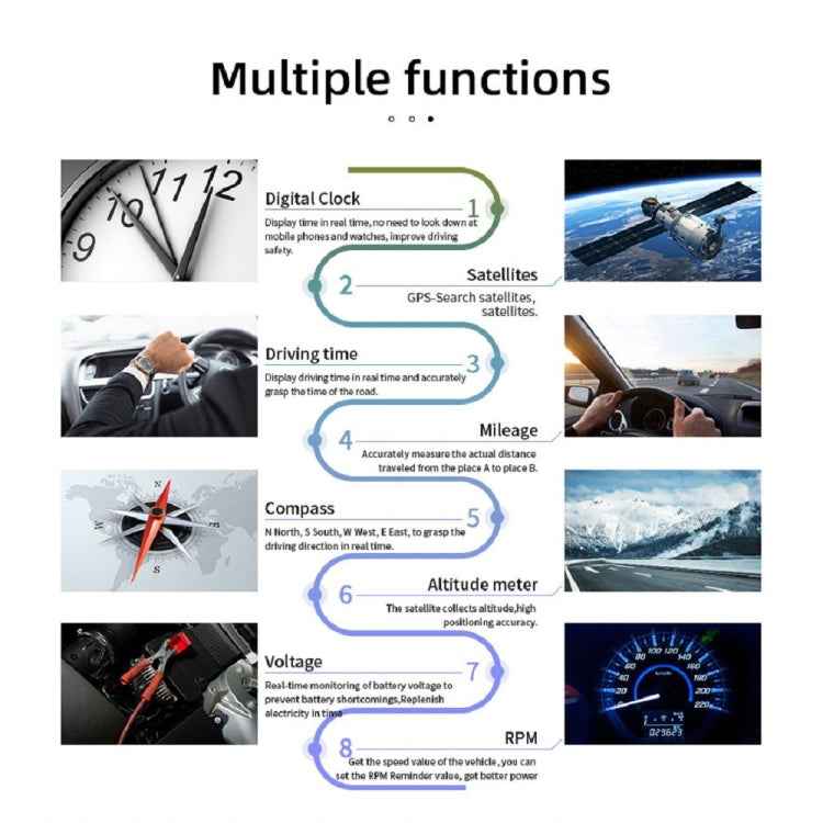 5. GPS mode display information: vehicle speed, voltage, mileage, driving time, local time, altitude, driving direction, number of satellites, acceleration test, brake test, 100 kilometers acceleration test, alarm: overspeed alarm, low voltage alarm features : Stereoscopic imaging uses semi-transparent and semi-reflective lenses to suspend the three-dimensional display of information in the air; no reflection, zero ghosting, and clearer display during the day