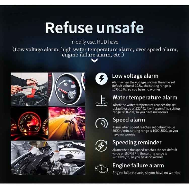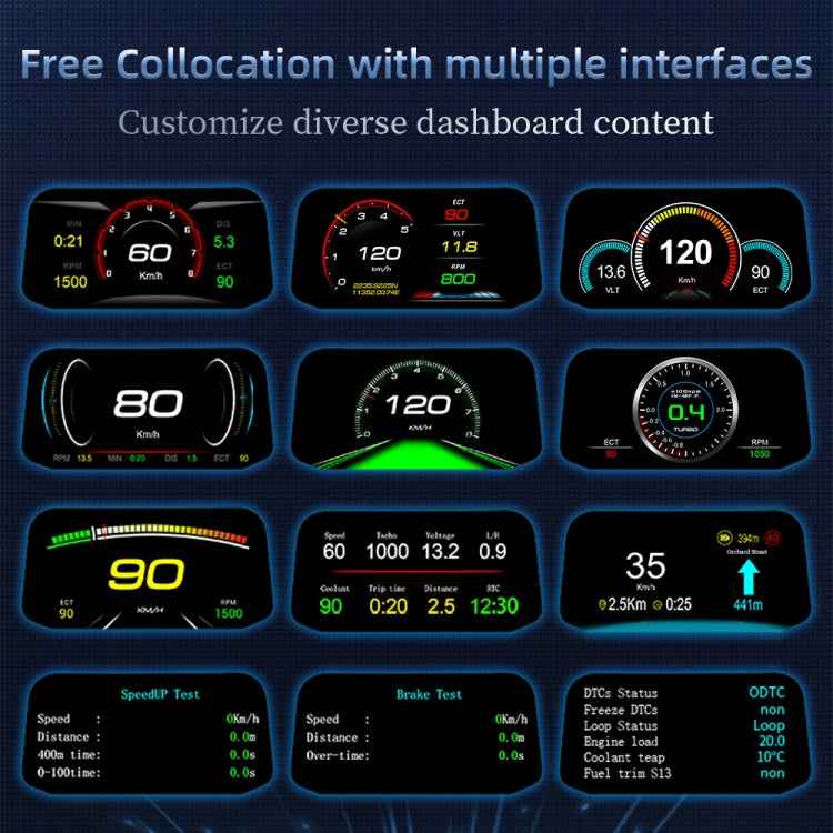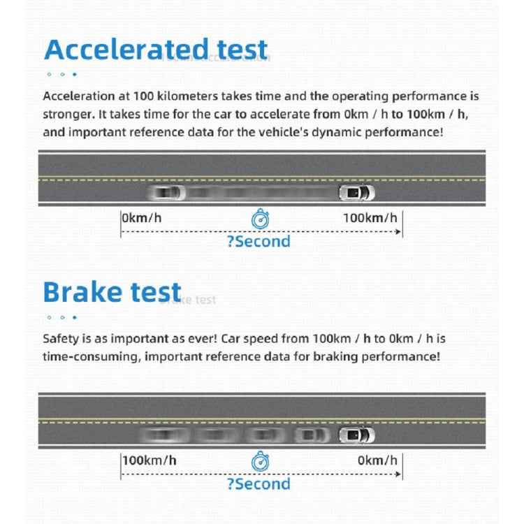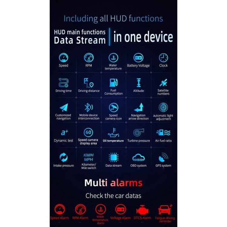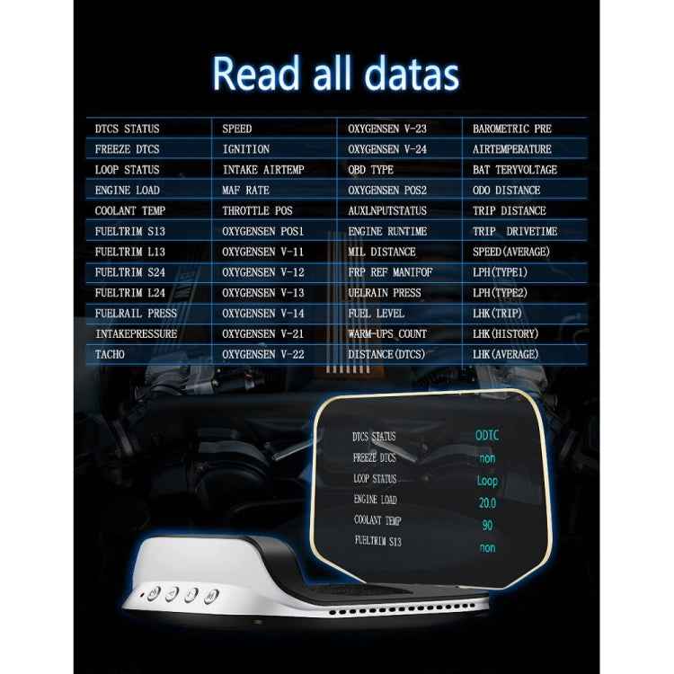 4. OBD mode display information: vehicle speed, speed, water temperature, voltage, mileage, driving time, fuel consumption, local time, oil temperature, driving direction, number of satellites, turbine pressure, air-fuel ratio, intake pressure, acceleration test, brake Test, 100 kilometers acceleration test, read the entire vehicle data stream, alarm: overspeed alarm, speed alarm, fatigue driving reminder, water temperature too high, voltage too low, engine failure alarm