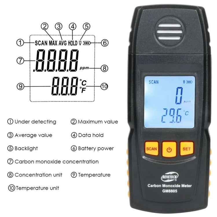 BENETECH GM8805 LCD Display Handheld Carbon Monoxide CO Monitor Detector Meter Tester, Measure Range: 0-1000ppm
