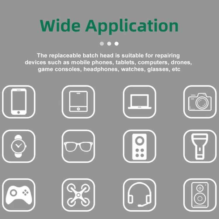 4. Configured with a variety of different shapes and specifications of the batch head, replaceable for desktop computers, notebooks, mobile phones, cameras, clocks, glasses, tablets, keyboards, mice, drones, toys, home appliances and other products maintenance and disassembly. The batch head can be replaced, suitable for the maintenance and disassembly of computers, notebooks, mobile phones, cameras and other products, which can meet the daily needs of most products